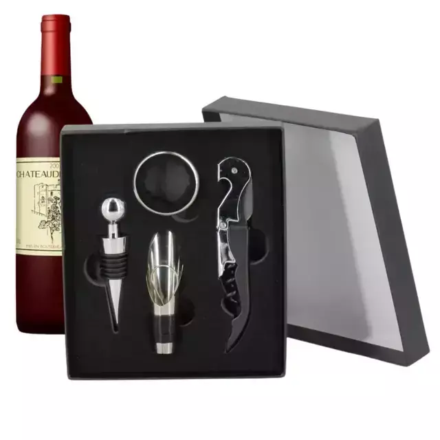 ? El Set de Vino 4 Piezas incluye todo lo que necesitás para disfrutar del vino como un verdadero sommelier: abridor profesional, tapón, vertedor y aro antigoteo.